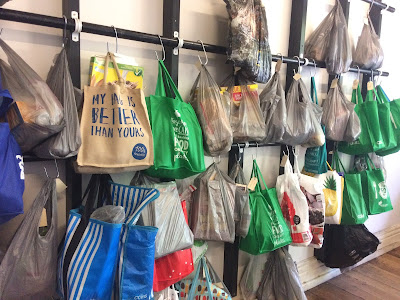フードストレージの棚が無い代わりに買い物袋をそのままつり下げるフックラックが壁に取り付けられている。